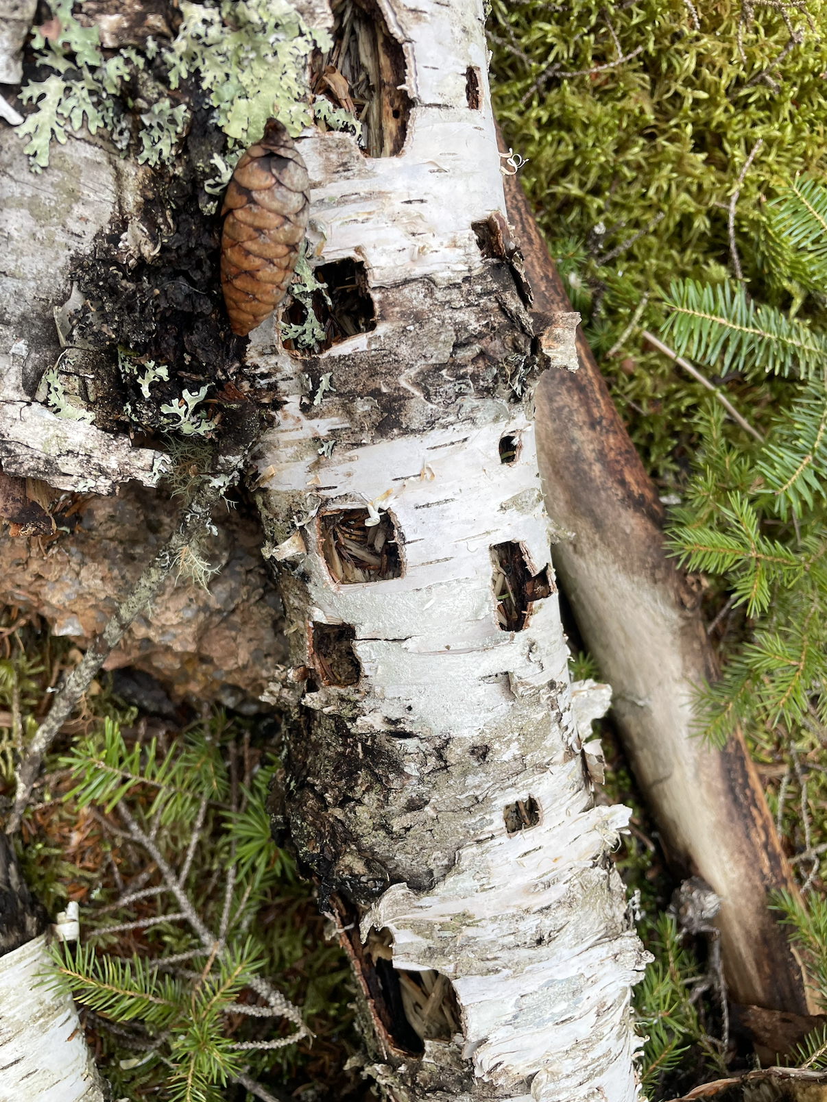 I wouldn’t make it to the island on this visit, as I wanted to get a sneak peek at what the hikers would be seeing on the following week’s walk. Among other finds, which I will post about later, I heard the irregular drum beats of a nearby woodpecker. I never really got a good look at it through the conifer stands that lined the trail, but woodpeckers are pretty common here on the island, so I moved on. A little bit later, I came across a downed birch tree shown in the image above. Being new to this naturalist business, I was struck by the regularity of the square and rectangular borings that went up and down this decaying log, as well as a few adjacent ones. They were so unlike the cavities I had seen in some standing trees that I had to wonder about their maker.