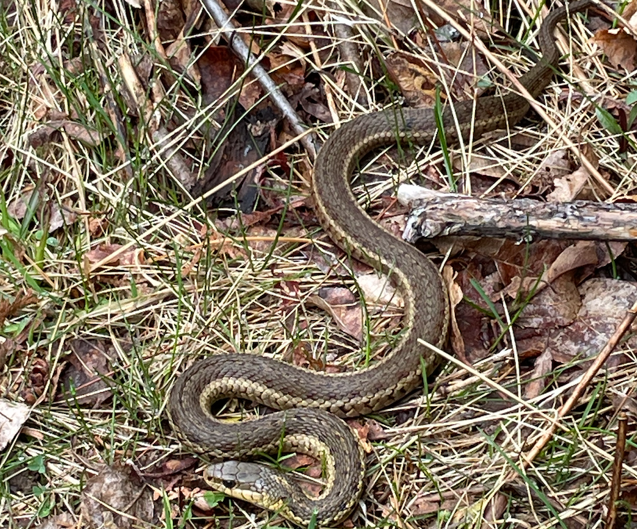 Yesterday I co-led a “Wednesday Hiking Club” visit to the Lisa Tolman Wooten Nature Preserve on Little Deer Isle. At the very end of our 90-minute walk, we came across this common garter snake (Thamnophis sirtalis) sunning itself at the edge of the trail, near the marshy entrance to the preserve. As a cold-blooded reptile, the garter snake needs to warm up before going about its business, and this one seemed either very courageous or perhaps still a little cold on that damp April morning.