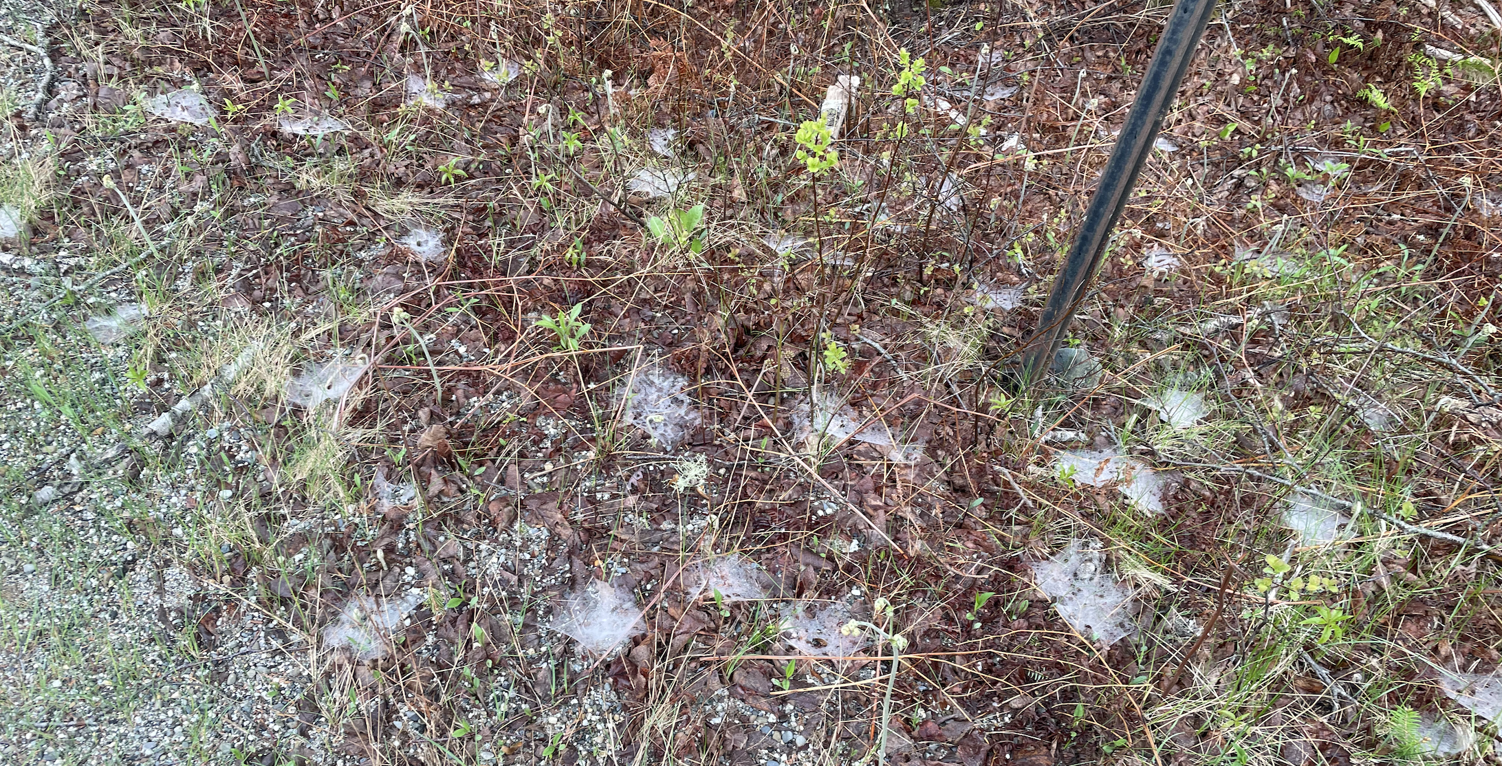 Overnight, a sudden blossom of funnel webs appeared in the damp grass along Sand Beach Road in Stonington. These webs are spun by grass spiders (genus Agelenopsis).