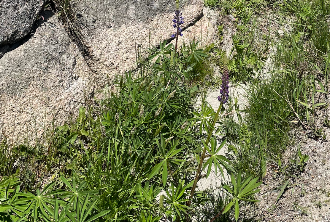 As Fay and I walked along Sand Beach Road, I saw my first lupine flower of the year. The lupine plants without flowers, with their long leaves arranged like petals around a daisy, are everywhere, and have been evident for weeks. But this was the first flower I have seen anywhere in the state in 2025. We had looked for them along 295 in Bowdoinham over Memorial Day Weekend, but there were none to be seen.