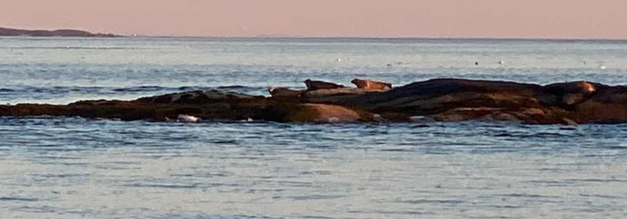 We motored past Stonington Harbor and got a striking view of Isle au Haut on the port side. Then, on a distant ledge, we spied a dozen or so gray seals enjoying their haul out. The gray seal (Halichoerus grypus) is bigger than the harbor seal; while the latter often appears alone or in a pair, bobbing in harbor, these gray seals tend to stay in groups. My wife had her phone ready, despite the distance, and captured some of the big grays just before they slipped back into the water.
