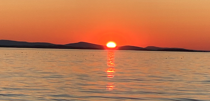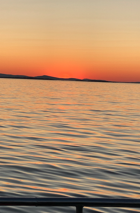We motored around Mark Island as the sun set. It’s a remarkable sight. One minute the full sun is just hanging above the horizon, and a minute later it has fully descended below the horizon. When you take it for granted, or when the view of the horizon is blocked, it can seem like sunset is a long, slow transition. But when you see the sun rise or set over a body of water, the speed at which it passes seems… cinematic, unreal.